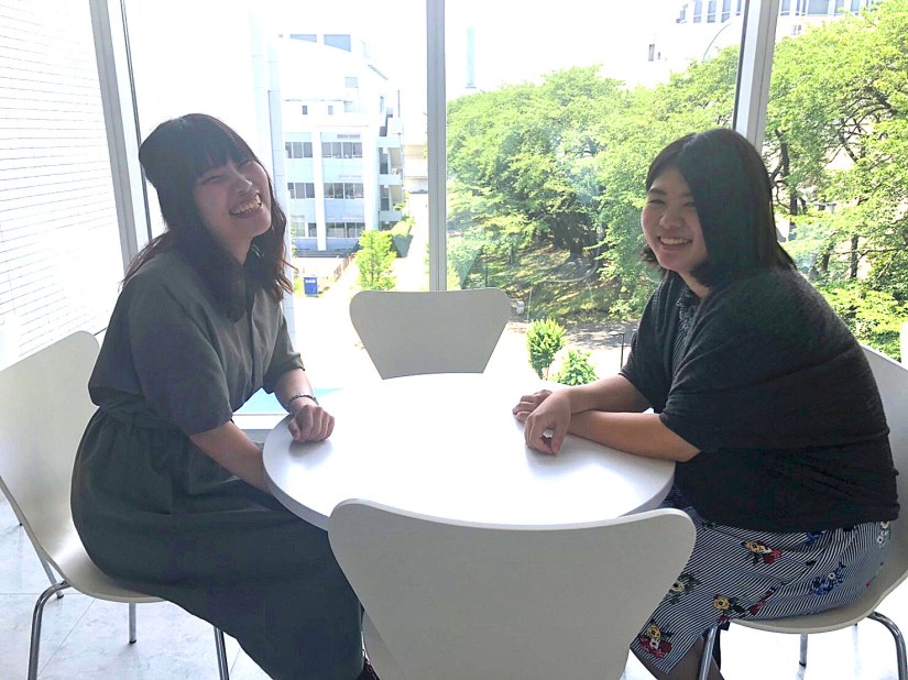 ブログに載せたい学生がたくさんいて, とっても迷いましたが… やっぱり記念すべき第 1 回目は, 担当している研究室の 4 年生に登場してもらうことにしました ! 本宮さん (左) と高野さん (右) です.