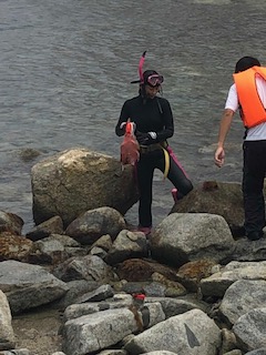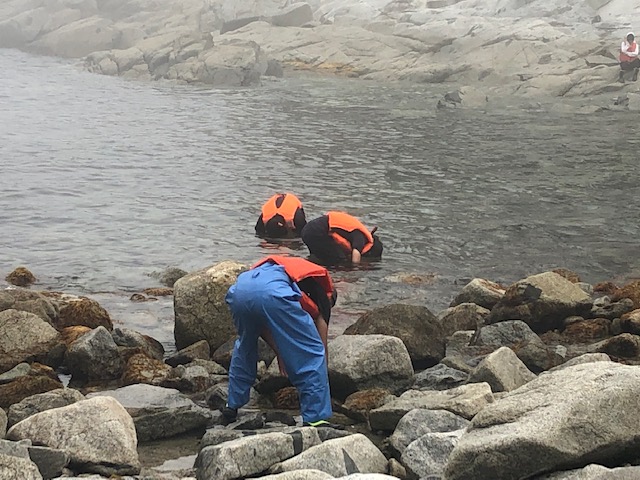 そのあとは, 磯採集です ! 今年はとても暑いですが, やっぱり夏空の下での磯採集は気持ちが良いです. 最初は濡れないようにしながら採集していた学生たちですが, 時間が経つと… みんな海が好きですねー (笑)