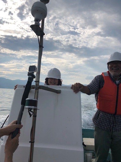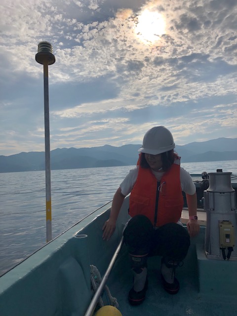 一通り走ったら, 次は着岸の練習. 一昨年は 10 連敗だったので今年こそは ! 港にいた小檜山先生 (環境微生物学研究室) も強制連行し乗ってもらいました. 私の操船を怖がって, みんな乗ってくれないんです ( ̄3 ̄) 今回は 5 回チャレンジしましたが… 3 回目は惜しかったんですけどね ƪ(˘⌣˘)ʃ 何回か岸壁に衝突しそうになり, 鬼教官が慌てて対処してくれましたが… 数回… ベリジャー号, ごめんなさい…