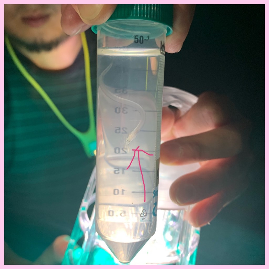 女子2人のテンションはピークに (笑) その横で, 大学院生の白鳥君は怖いくらい真剣な顔でシラスウナギを観察 … ではなくて, 「目力くださーい」と言ったらこんな表情に (笑) 一緒に参加した大学院生の津野君も含めて, 採集されたシラスウナギを観察しながら盛り上がっていました (╹◡╹)