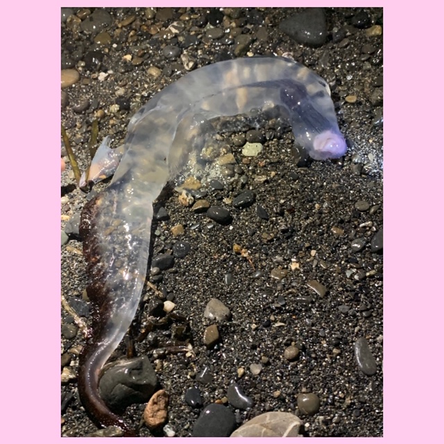 面白い生物が打ち上げられていないか, 静岡県三保の海岸に行ってきたそうで (笑), その成果 ? の写真でした. この生物の正体は, ゾウクラゲという巻貝でした. まさかの貝 ( ゚д゚) これが… 貝… 海洋生物って, 本当に不思議な形態の生物が多くて面白いですね 🧐✨ 先端のピンク色の部位が可愛いですね 💕