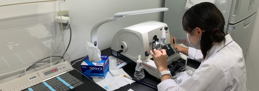 4 年生の日比野さんが, シロギスの脳の切片を作製 (薄〜くスライスする実験) していました. 綺麗な切片を作製するためには集中力が必要です. お腹すいたなー, 疲れたなーと集中力が切れると, その気持ちがそのまま表れます 🧠