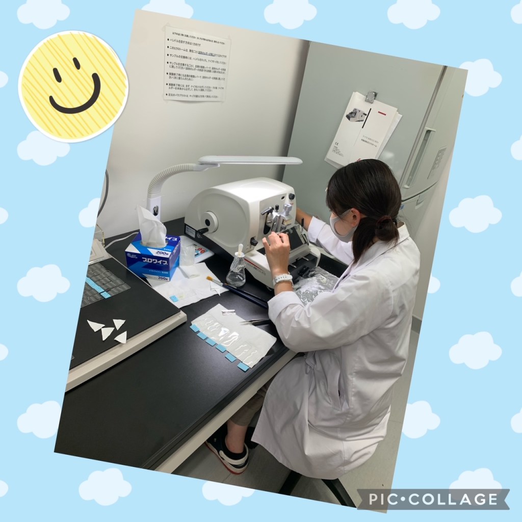日比野さんは, 午後ずーっと切片を作製していました. 様子を見に行くと, なんか変な塊が… 集中力が切れてしまってこんなことになってしまいました 😱 とのこと. どれだけ集中力切れたらこんな見たこともない形態になるの !? 😳 休憩したら復活しました, と見せてくれたスライスはとても綺麗にできていました (笑)