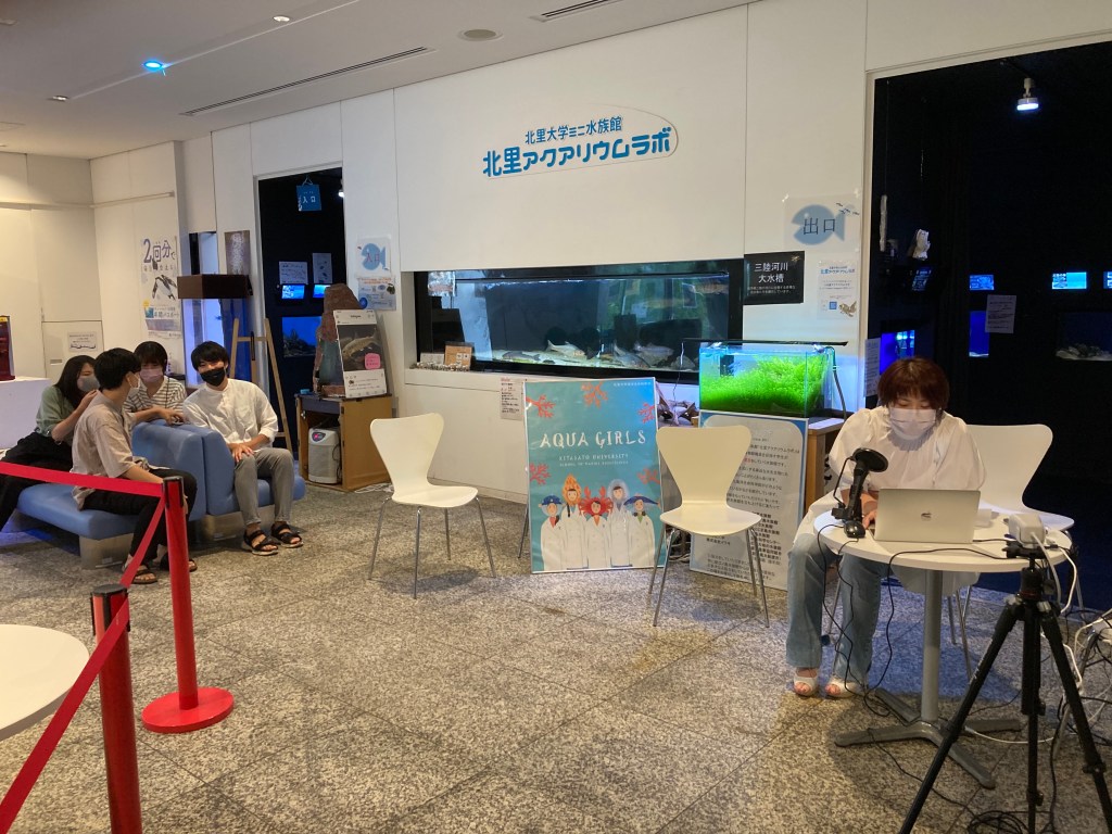 今回の模擬講義は, 初めて海洋生命科学部の学部棟からの配信となりました. アクアリウムラボをバックに講義したので, 海洋らしい雰囲気を出せたのではないかと思います 🐟