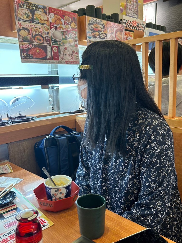 お茶の淹れ方もわからなかった片桐さん 😳 お寿司が届けられる時のレーンの速さに驚く片桐さん 🤣 回っているお寿司を取ろうとして取れない片桐さん (私が取りました) 🌀 どれを食べようか悩みすぎてなかなか注文できない片桐さん 🍣 回っているお寿司をずっと見ている片桐さん 👀